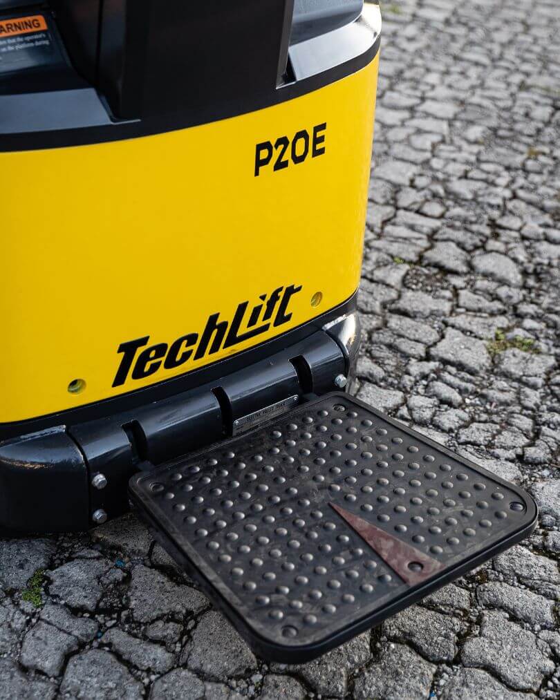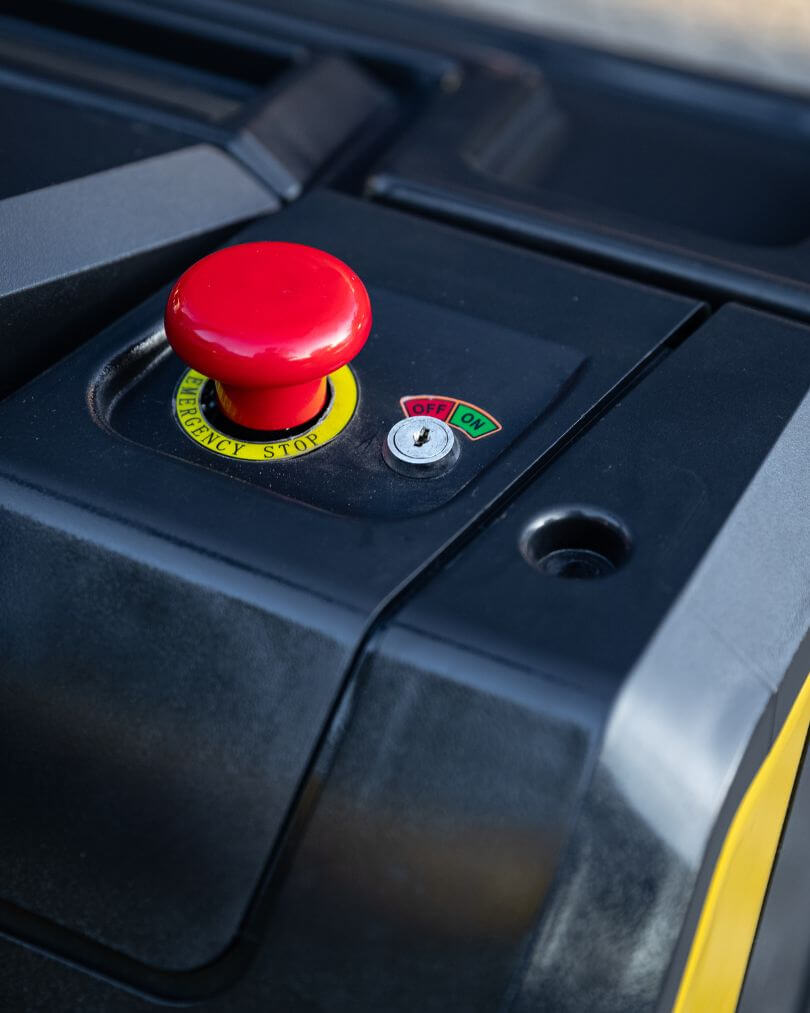 O equipamento possui três tipos de frenagem (regenerativa, reversa e de emergência) para maior controle e segurança. Conta com função antiderrapante em rampas, botão de emergência no volante, chave limitadora de elevação e redução automática de velocidade em curvas no modo de operação em pé.
